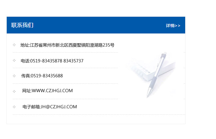 傳真:0519-83435688    郵編:213135    網址:WWW.czjhgj_com.nonglicanshi.com    電子郵箱:JH@czjhgj_com.nonglicanshi.com